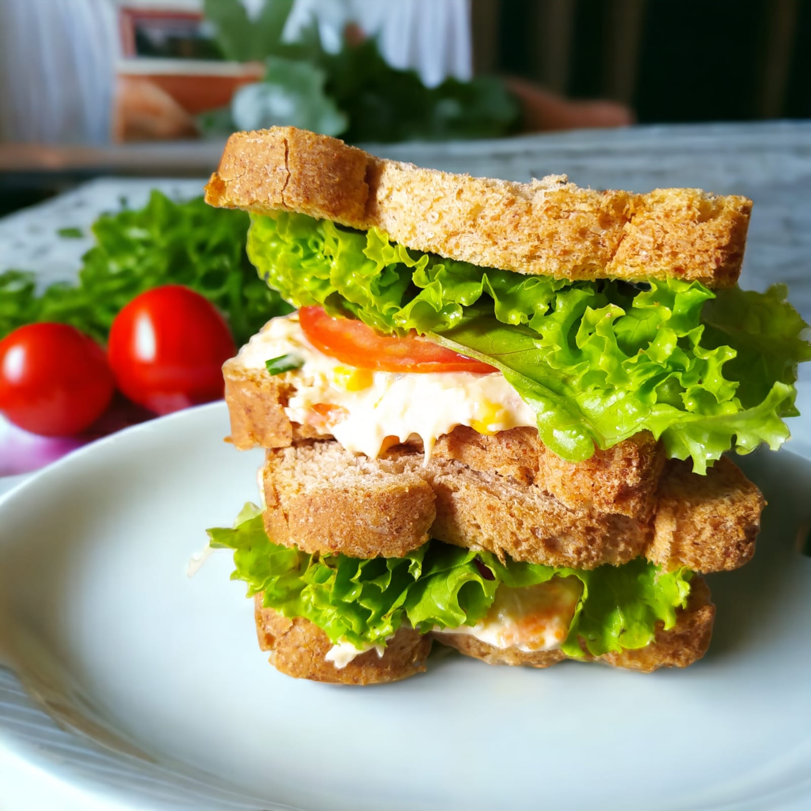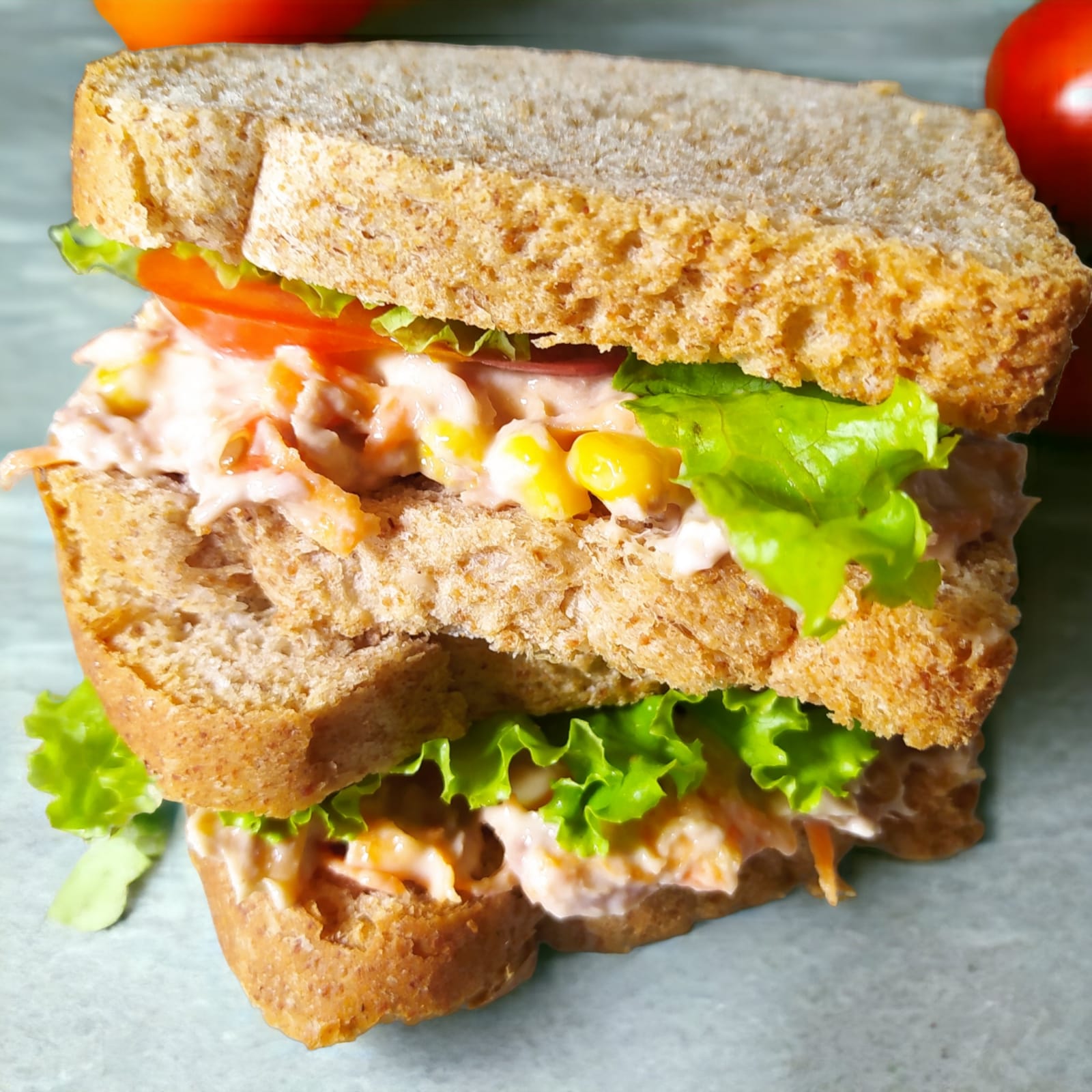 Sanduiche de pão de forma, com atum desfiado, cenoura ralada, milho, maionese, tomate e alface.