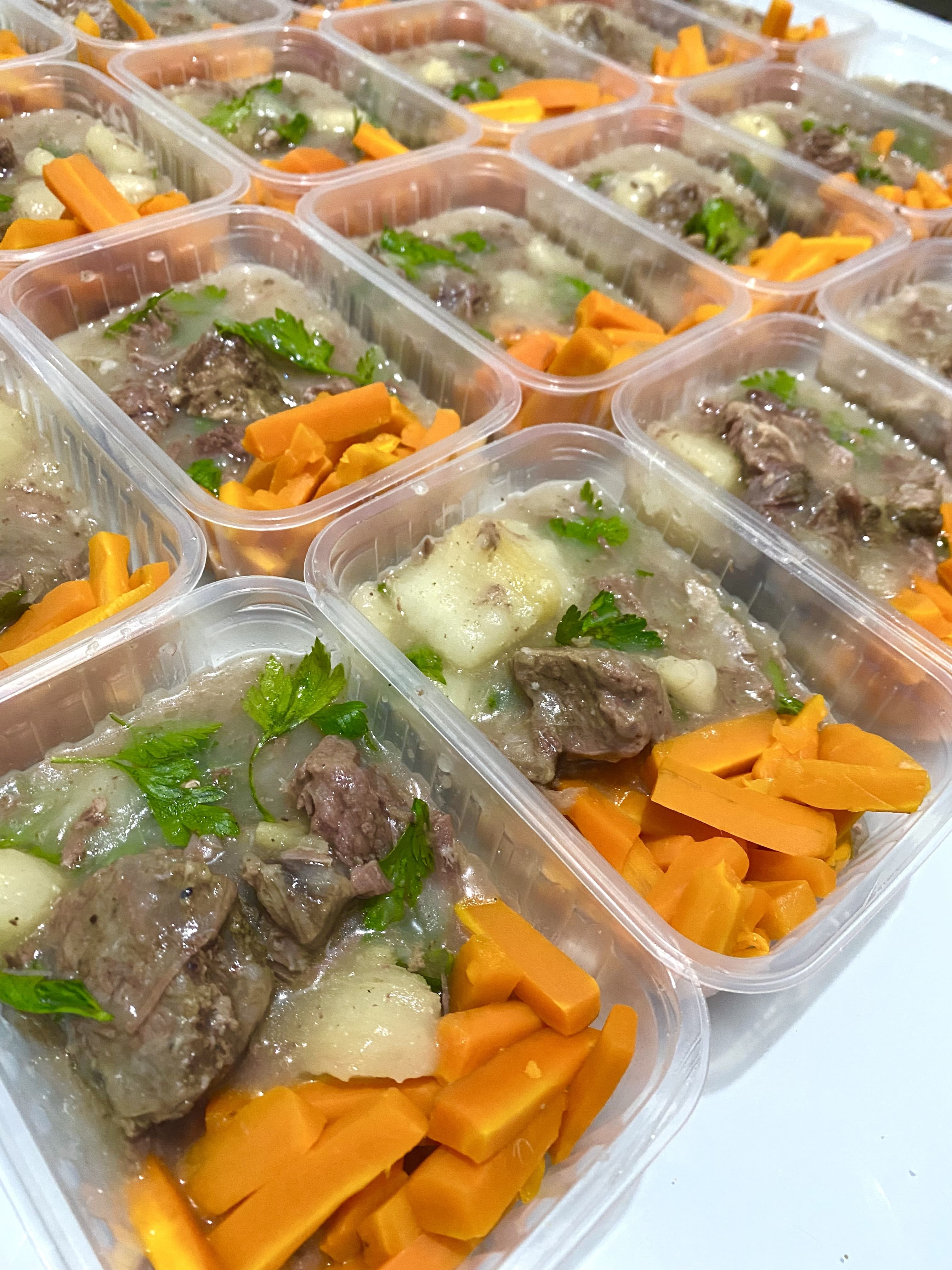 Suculenta e saborosa carne bovina cozida com mandioquinha e cheiro verde, cenoura cozida de acompanhamento