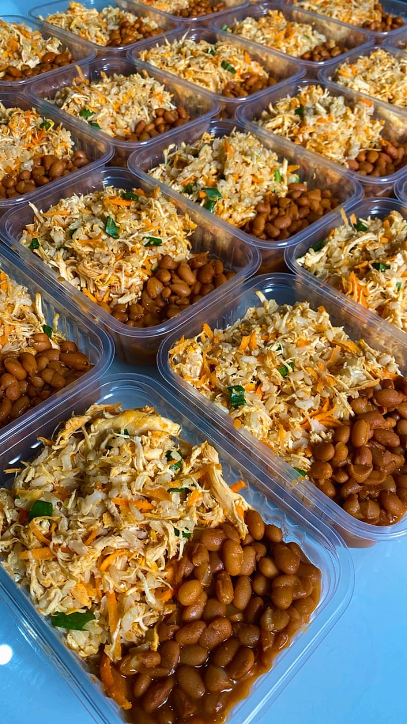 saboroso arroz integral com frango desfiado, cenoura ralada e cheiro verde, feijão carioca para acompanhar