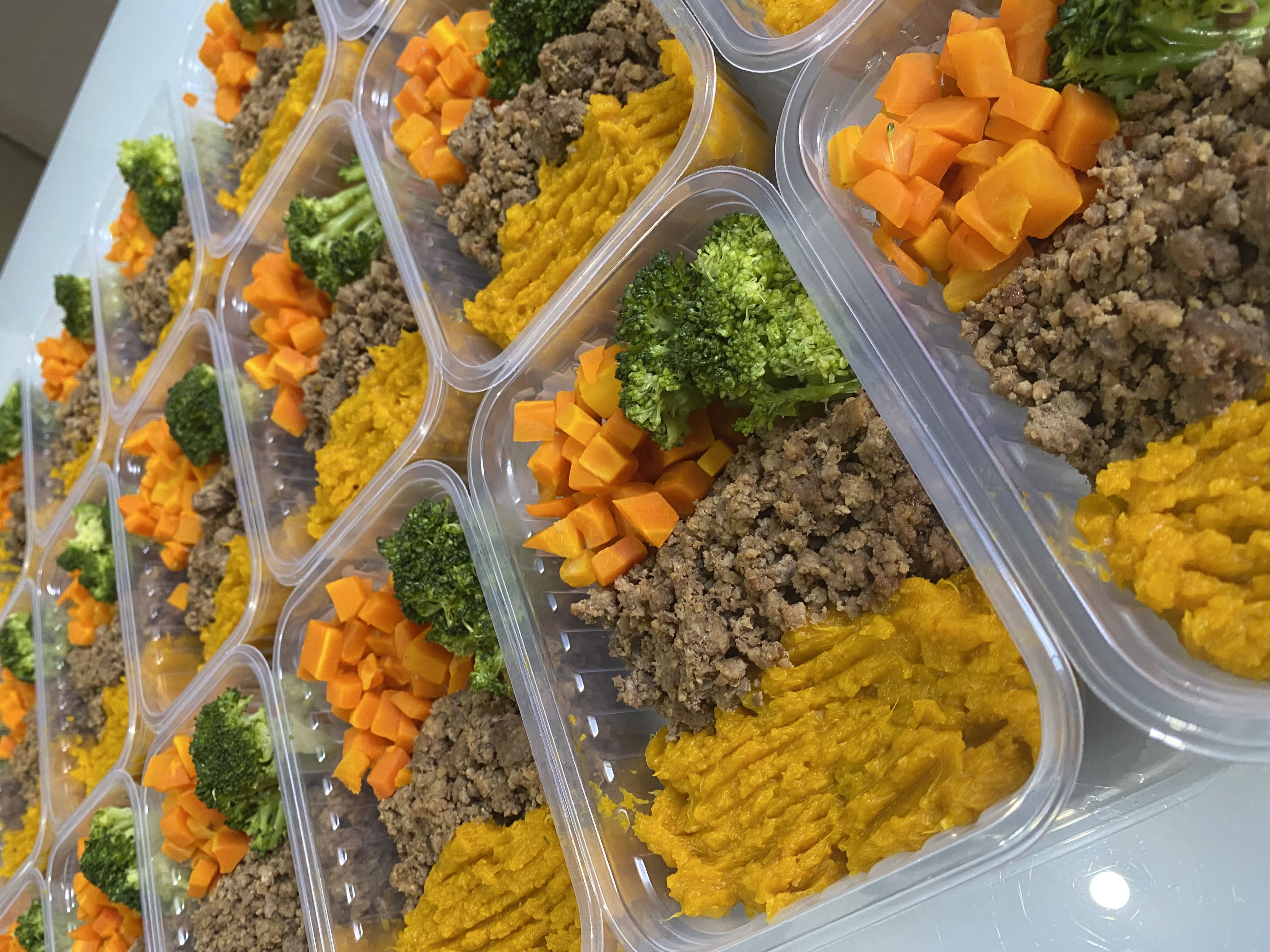 Saborosa carne moída, purê de abóbora, cenoura e brócolis cozidos